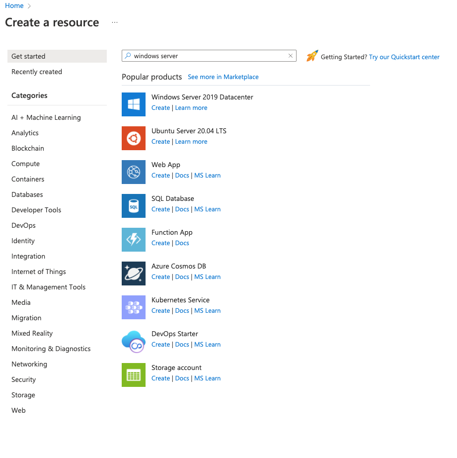 Select Create a resource from the Azure portal’s Azure services section. The pane to create a resource appears.