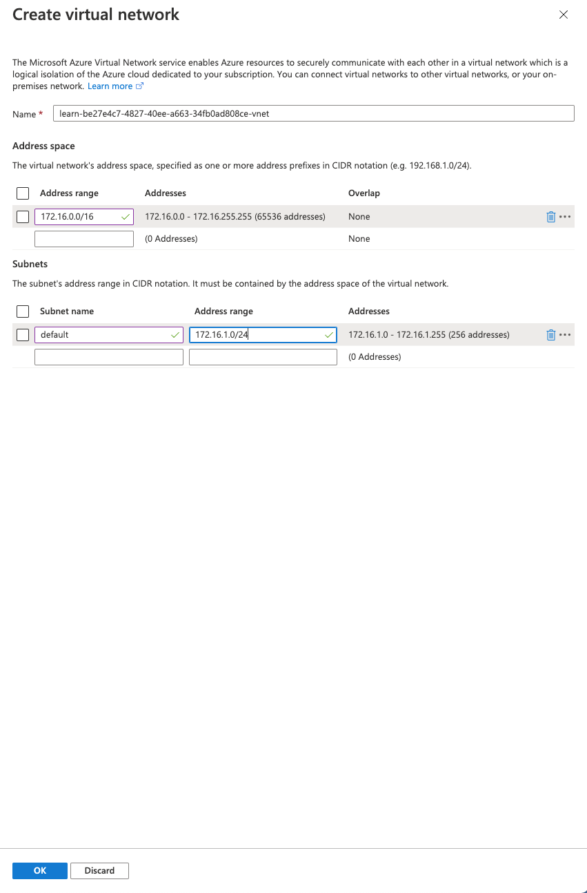 Under the input field for Virtual network, select Create new. The Create virtual network pane appears.