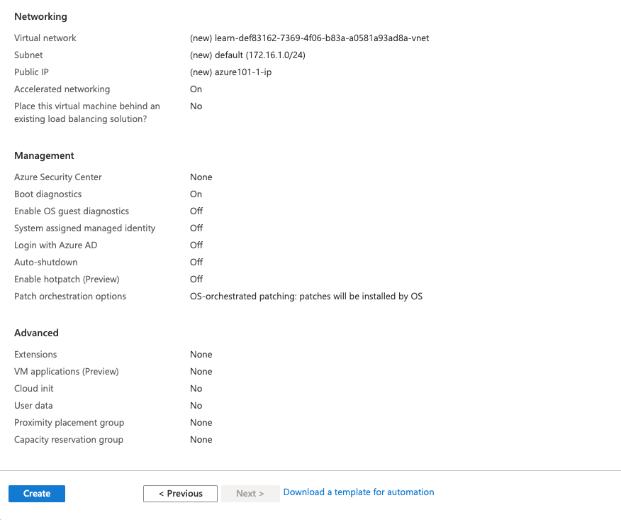 Select Review + create. The system will validate your options and display details about the VM being created.
